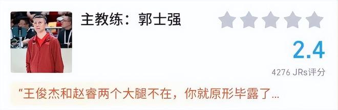 最后就是中国男篮的主教练郭士强了,他的评分只有2.4分,从这里就能够看出球迷对他的执教是多么不满了。从这两场比赛的表现来看,郭士强还在让中国男篮打十几二十年前的篮球,主要就是以内线为主。另外在选人和用人方面,郭士强的问题也非常大。不少球迷都直言,缺少了赵睿和王俊杰后,郭士强就原形毕露了!
