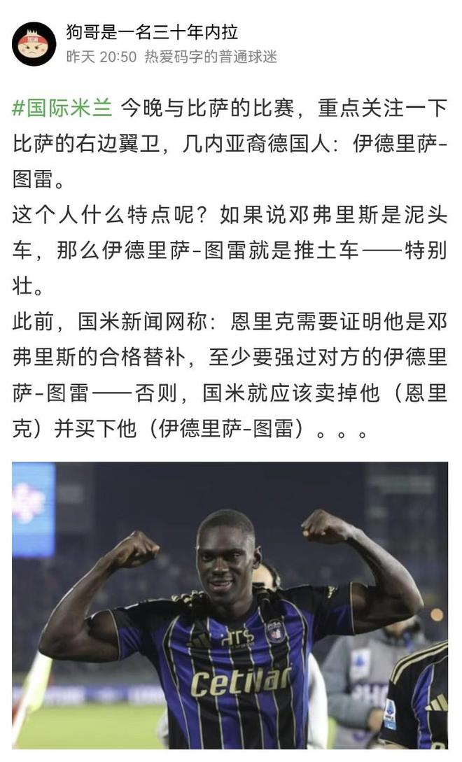 思来想去,或许我的担心是多余的。毕竟,国米的赛程非常密集,每一个位置可能都需要充分的储备,尤其是迪乌夫和恩里克两人,其实都是有能力打多个位置的,而且,同为肌肉流,这是他们的天生优势,他们必然有用武之地——前提是,正如很多老哥在群里说的那样,恩里克必须要客服自己的畏惧心理!不妨也做一名执仞的武夫,你和迪乌夫平时多练练,拼个刺刀啥的。。。